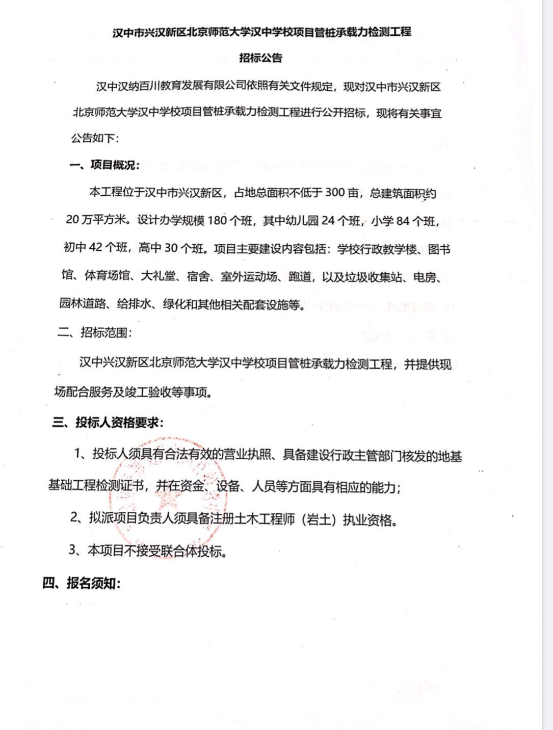 漢中市興漢新區北京師范大學漢中學校項目管樁承載力檢測工程招標公告 漢中漢納百川教育發(fā)展有限公司...